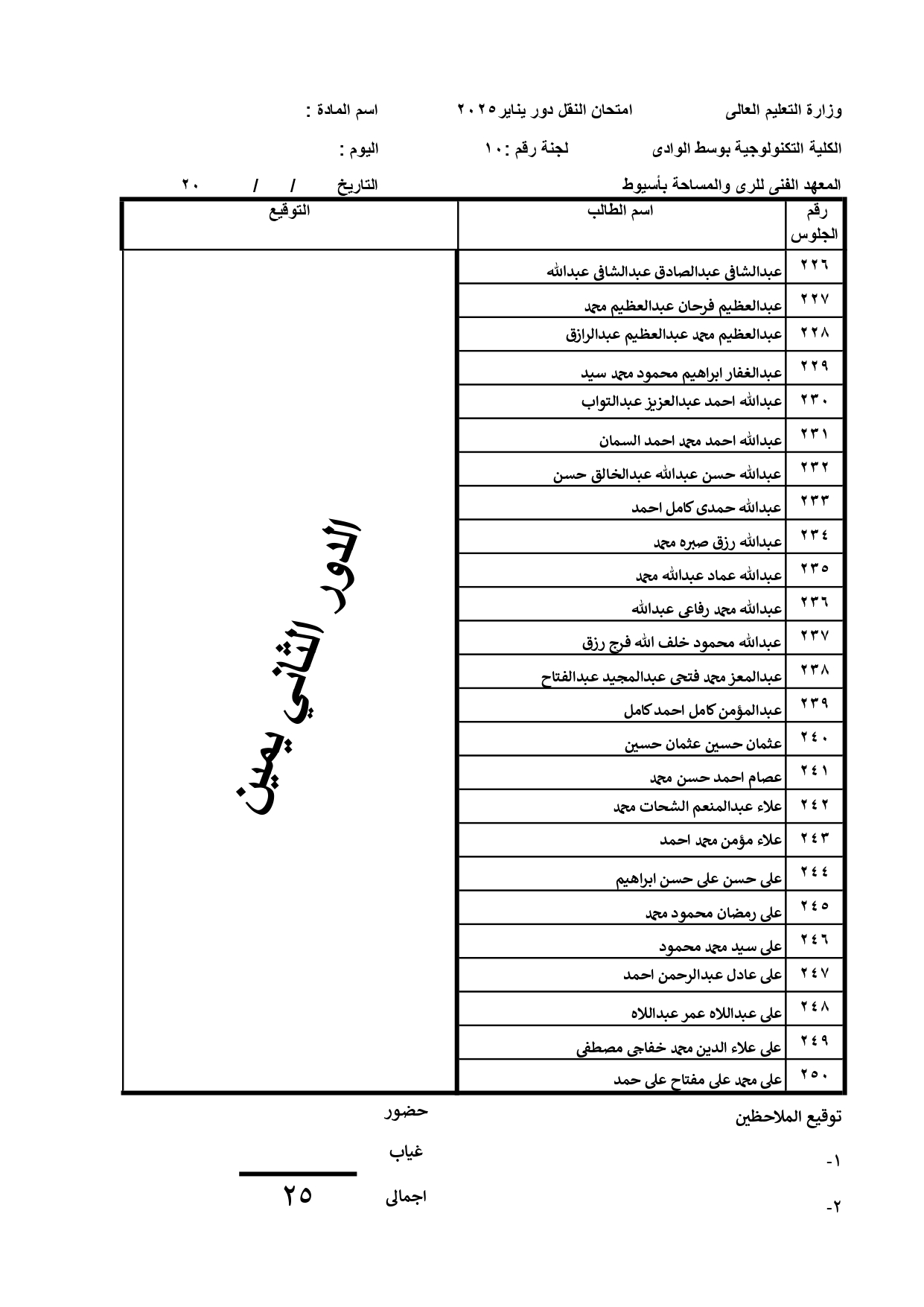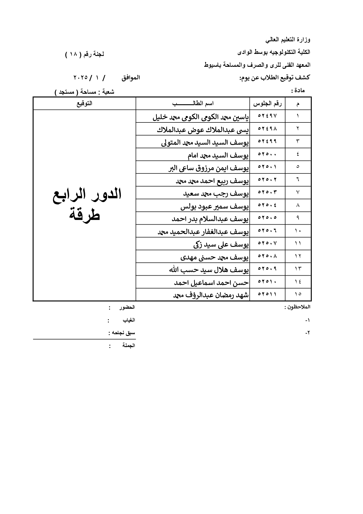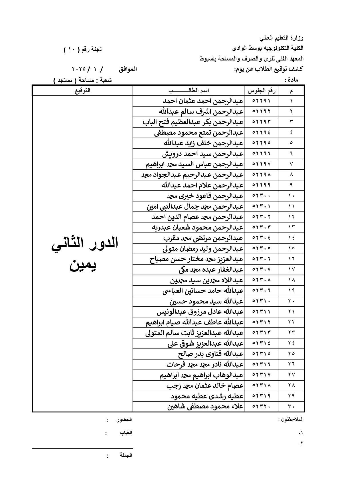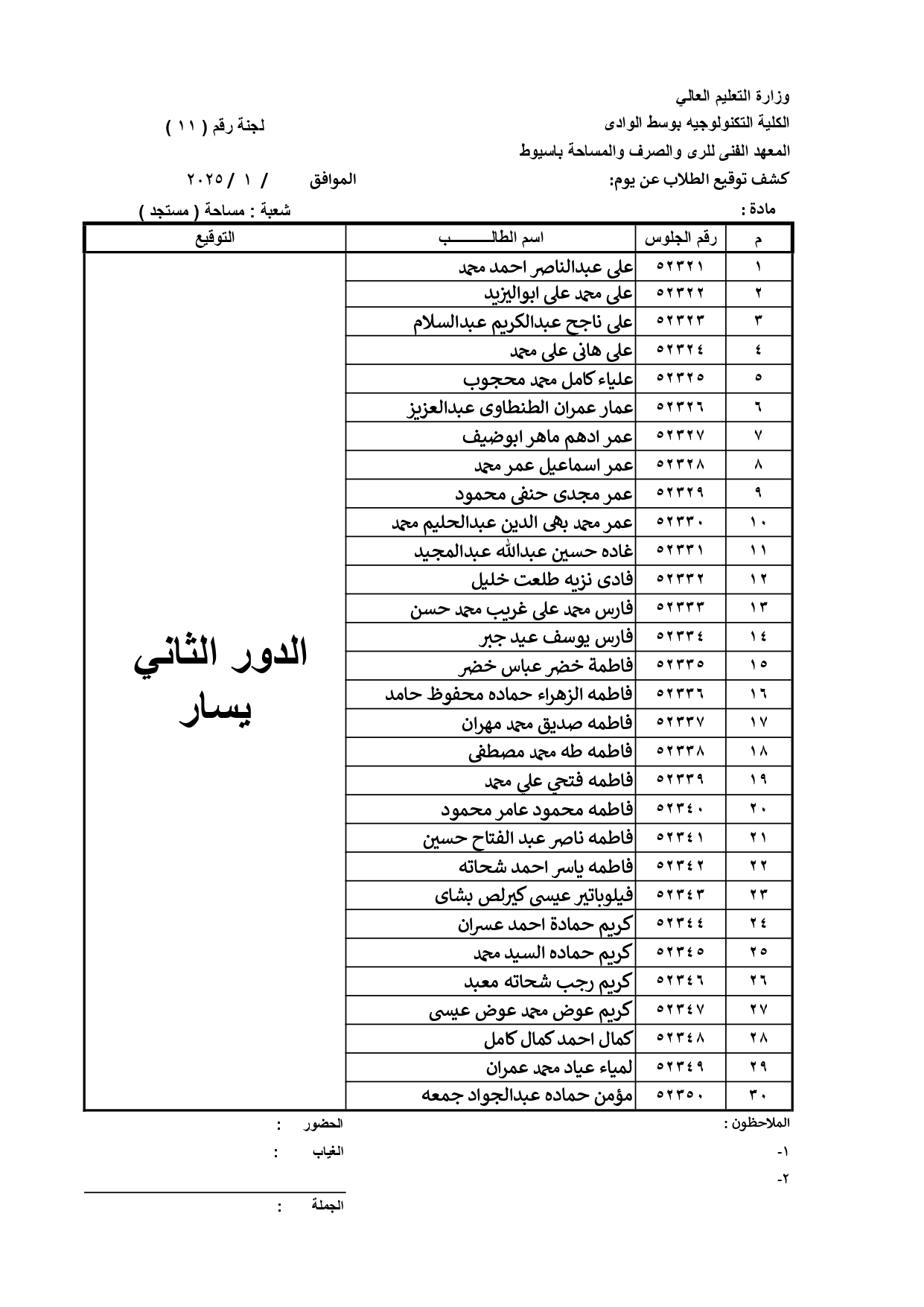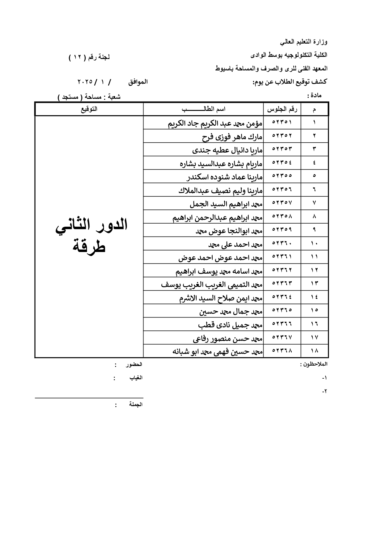 | الخميس | 2 /1 /2025 | تكنولوجيا معلومات | 10 | 12 |