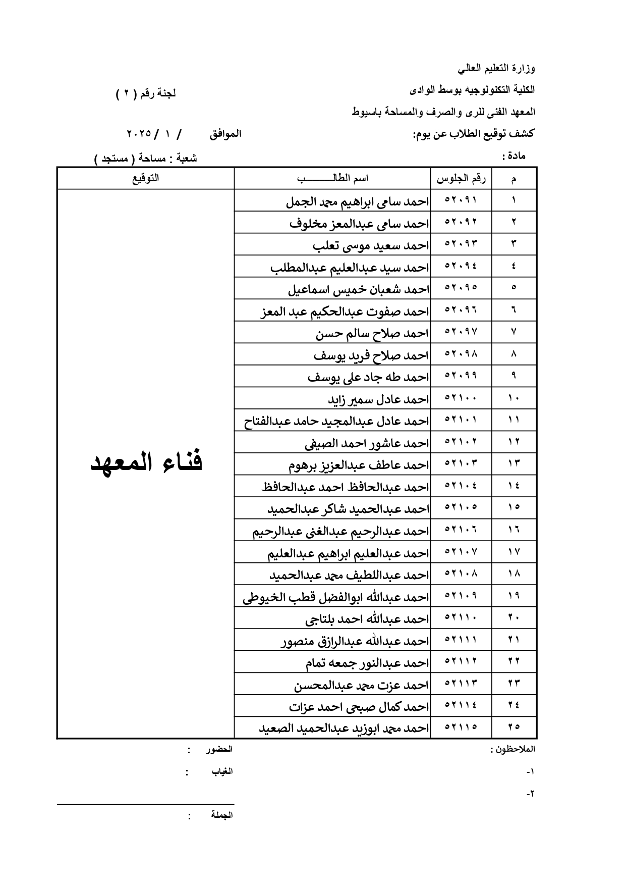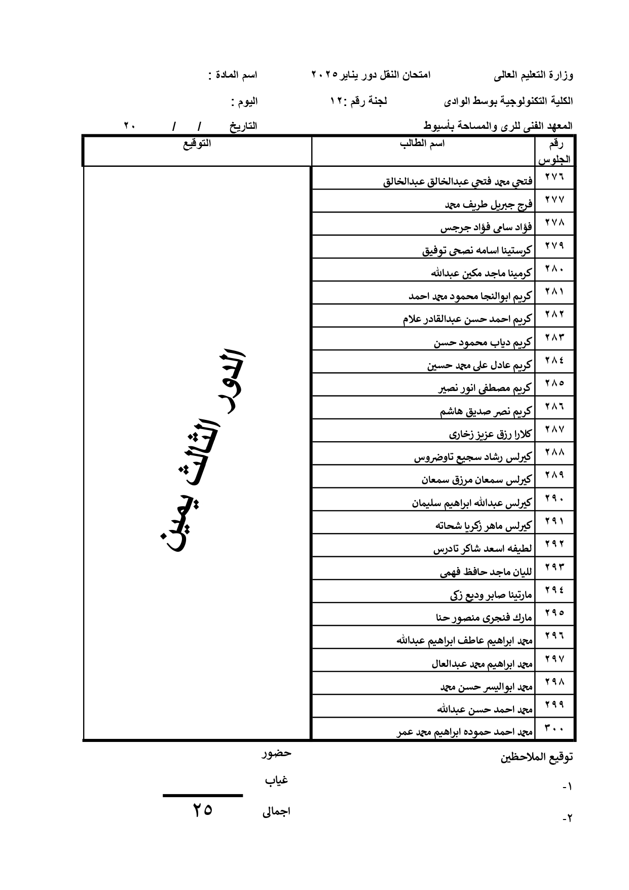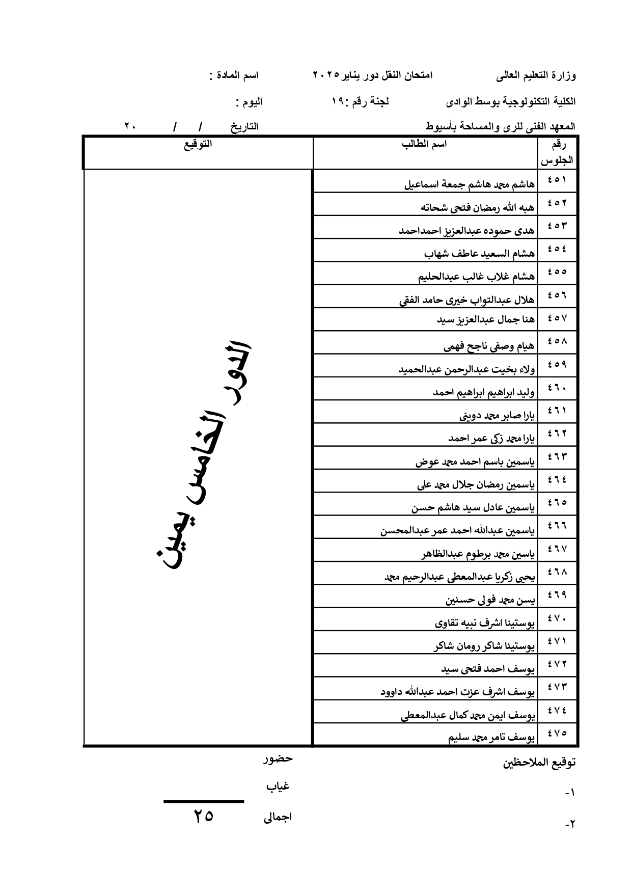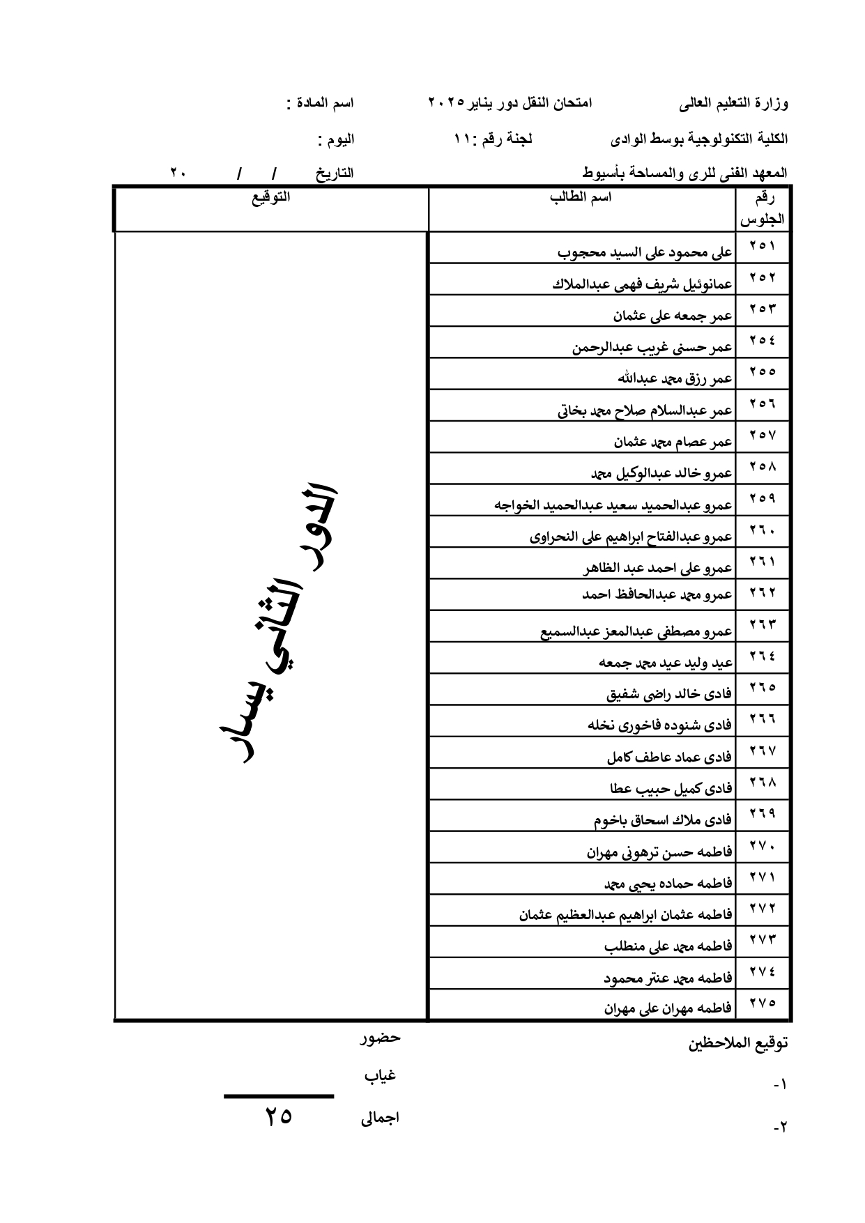 | الخميس | 2 /1 /2025 | تكنولوجيا معلومات | 10 | 12 |
