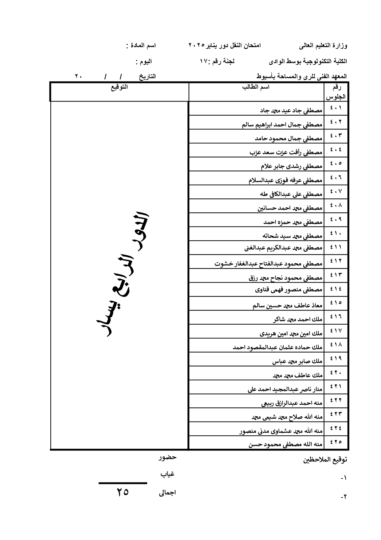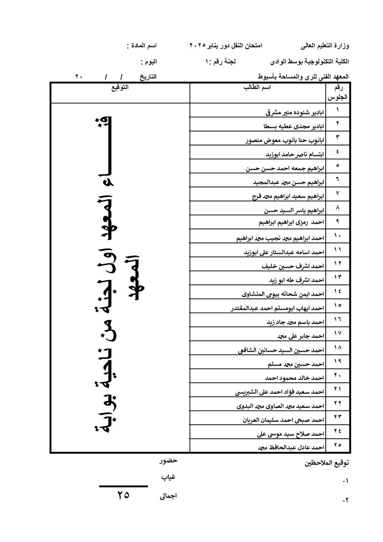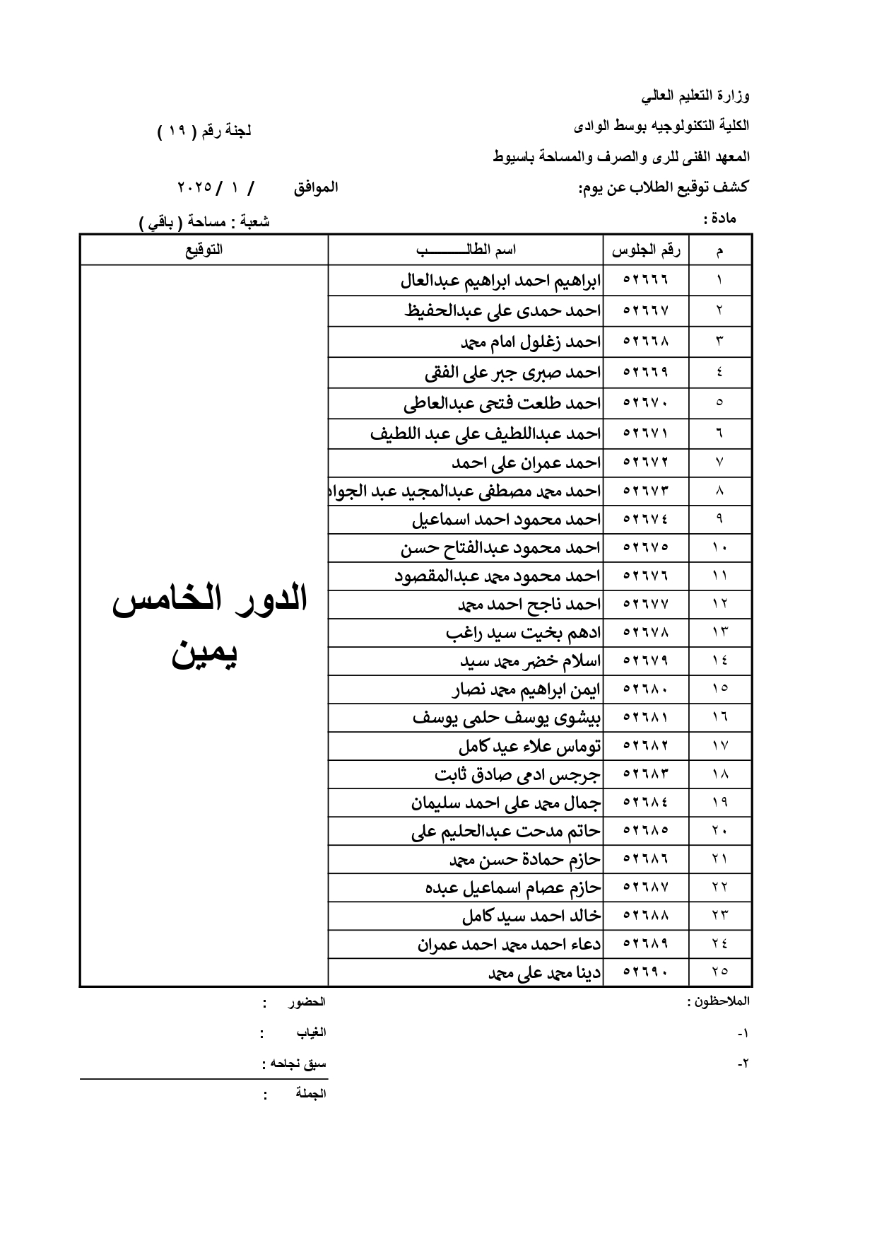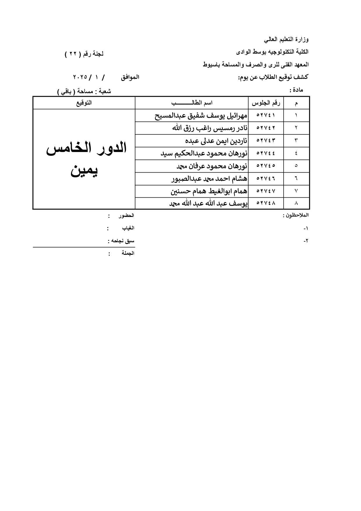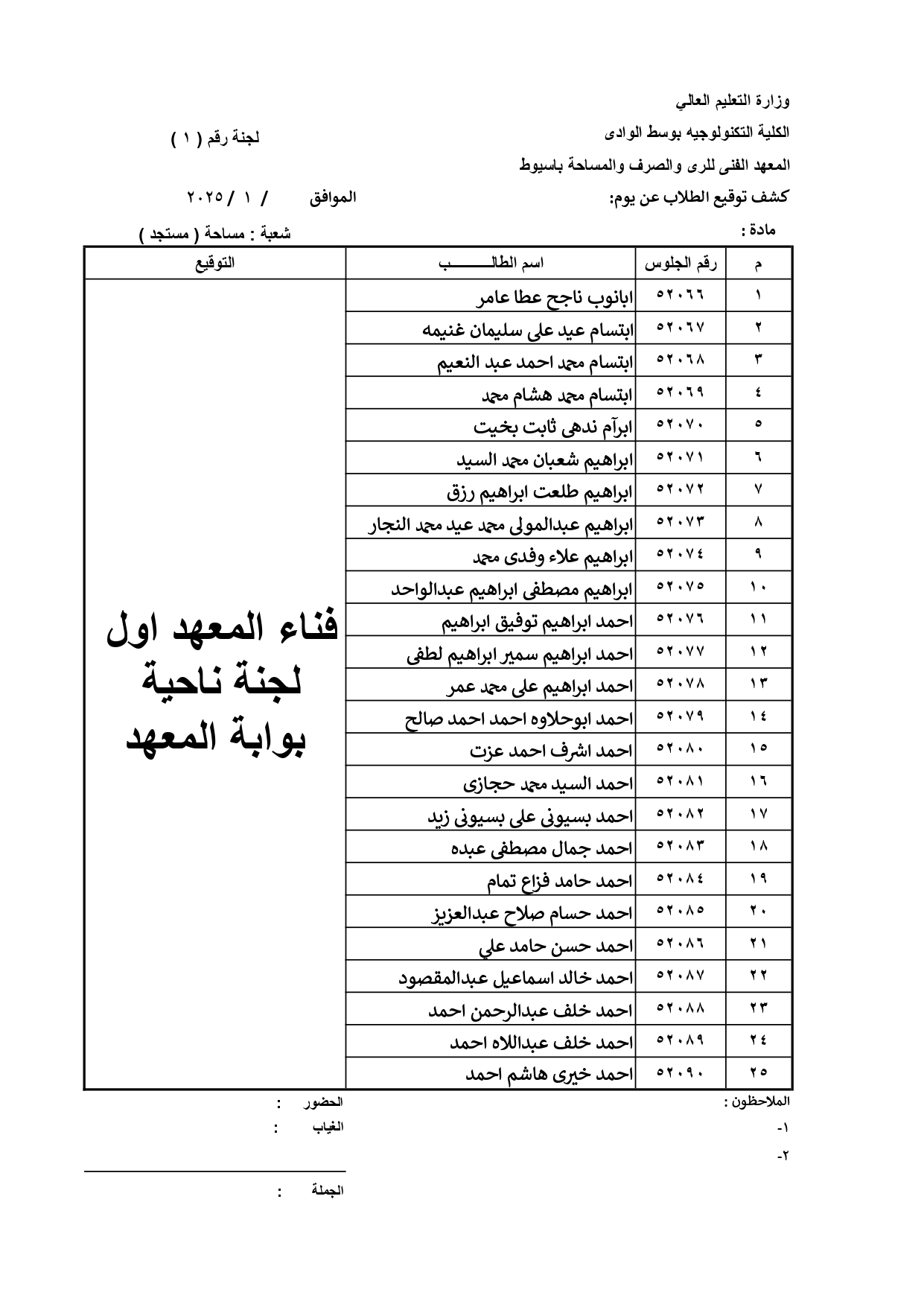 | الخميس | 2 /1 /2025 | تكنولوجيا معلومات | 10 | 12 |