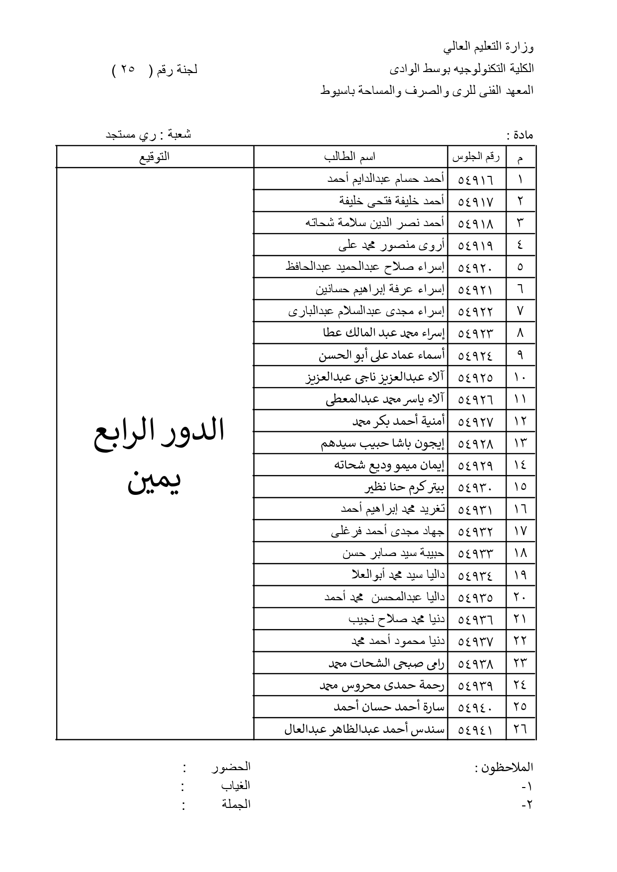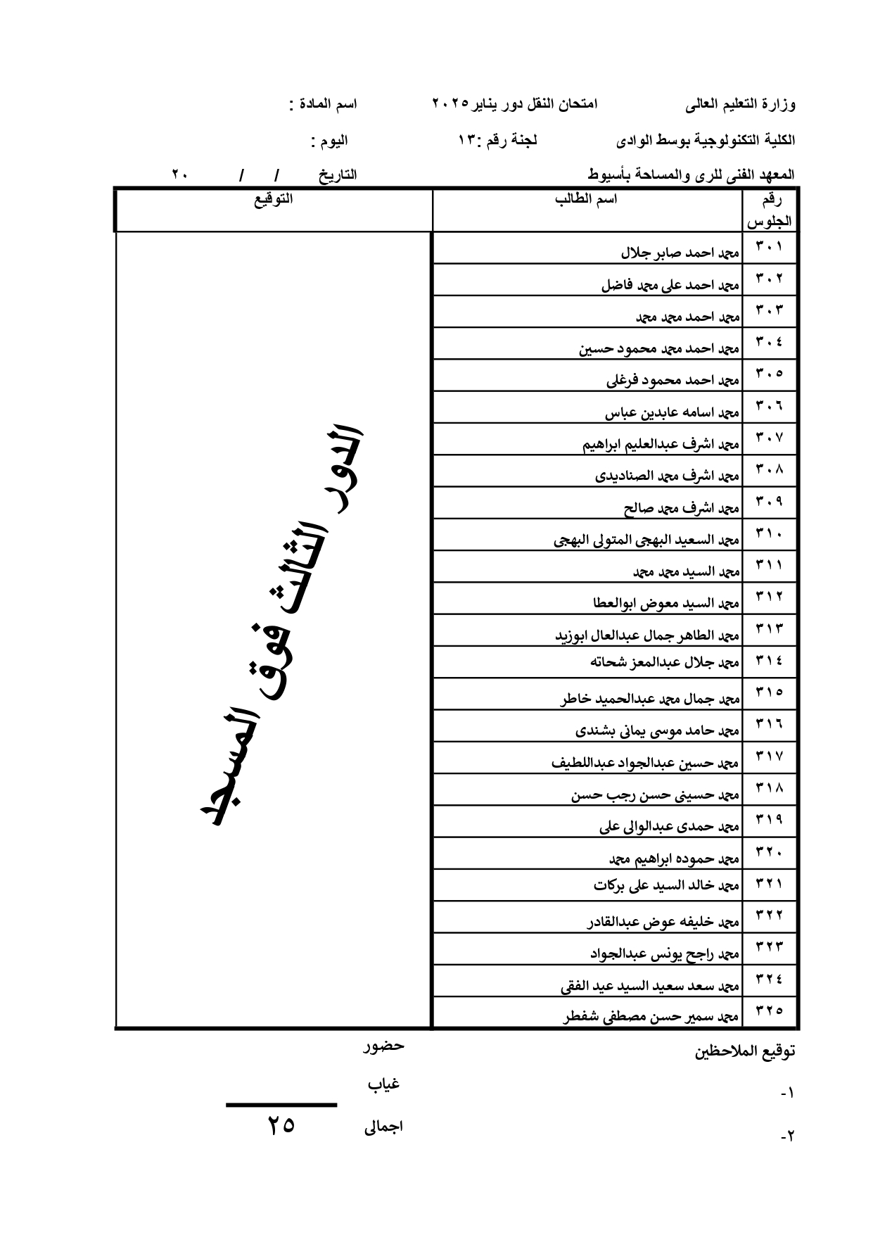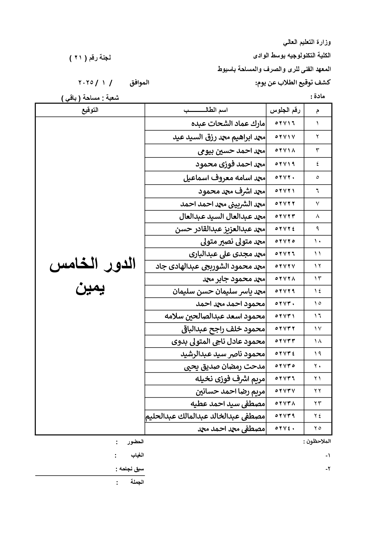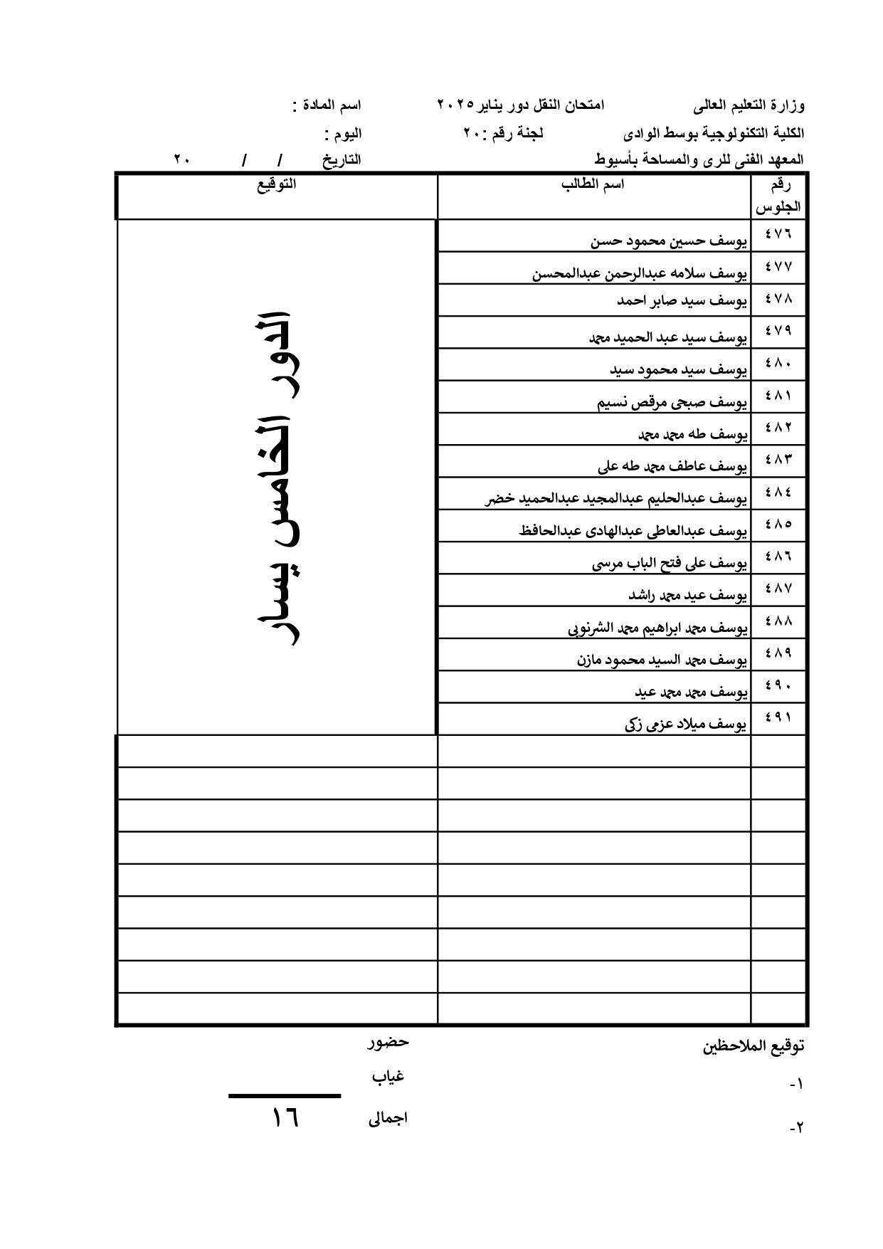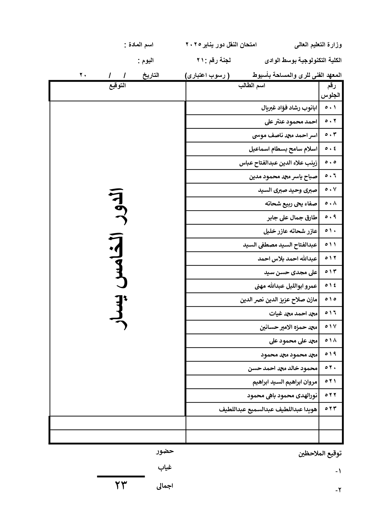 | الخميس | 2 /1 /2025 | تكنولوجيا معلومات | 10 | 12 |
