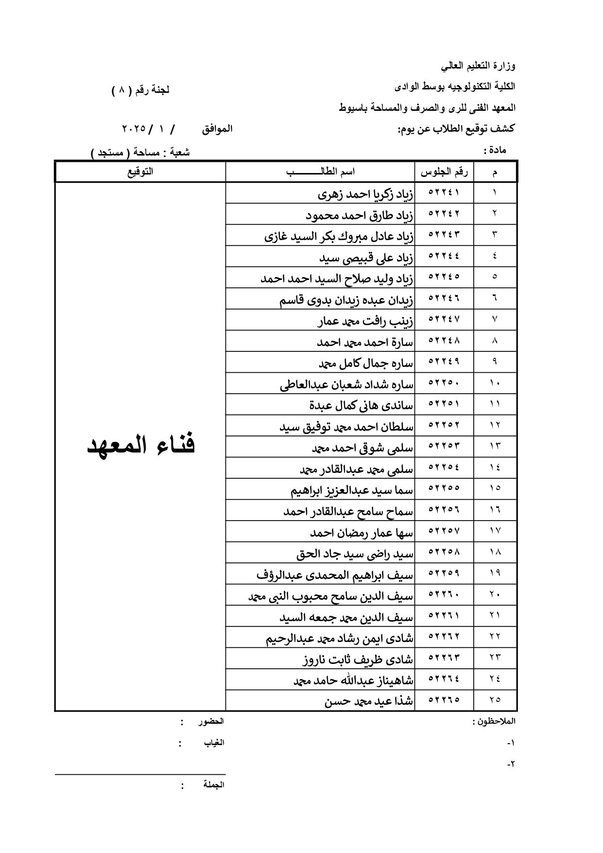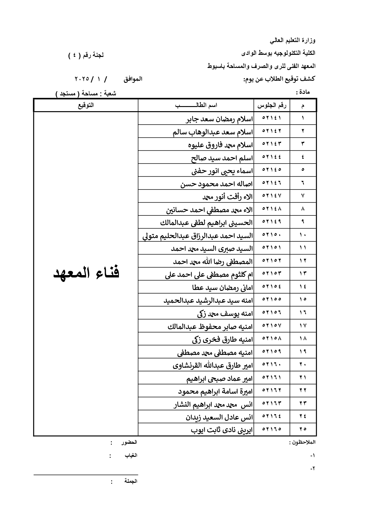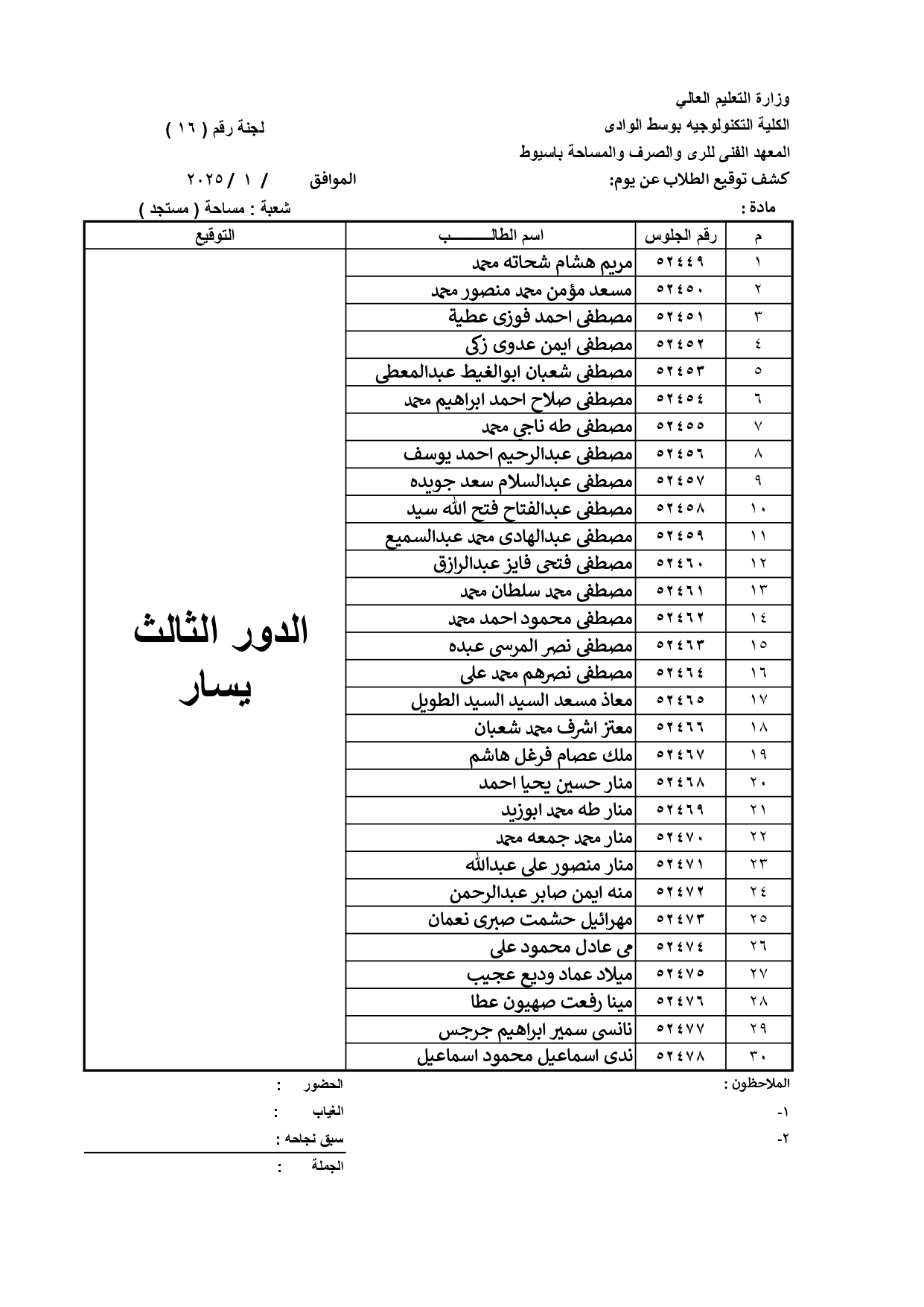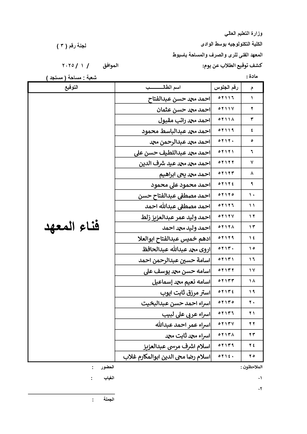 | الثلاثاء | 31 /12 /2024 | اجهزة مساحية | 10 | 12 |