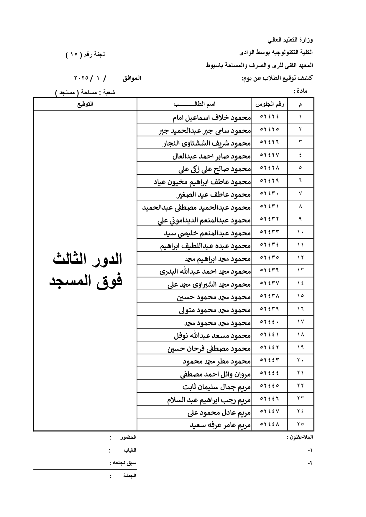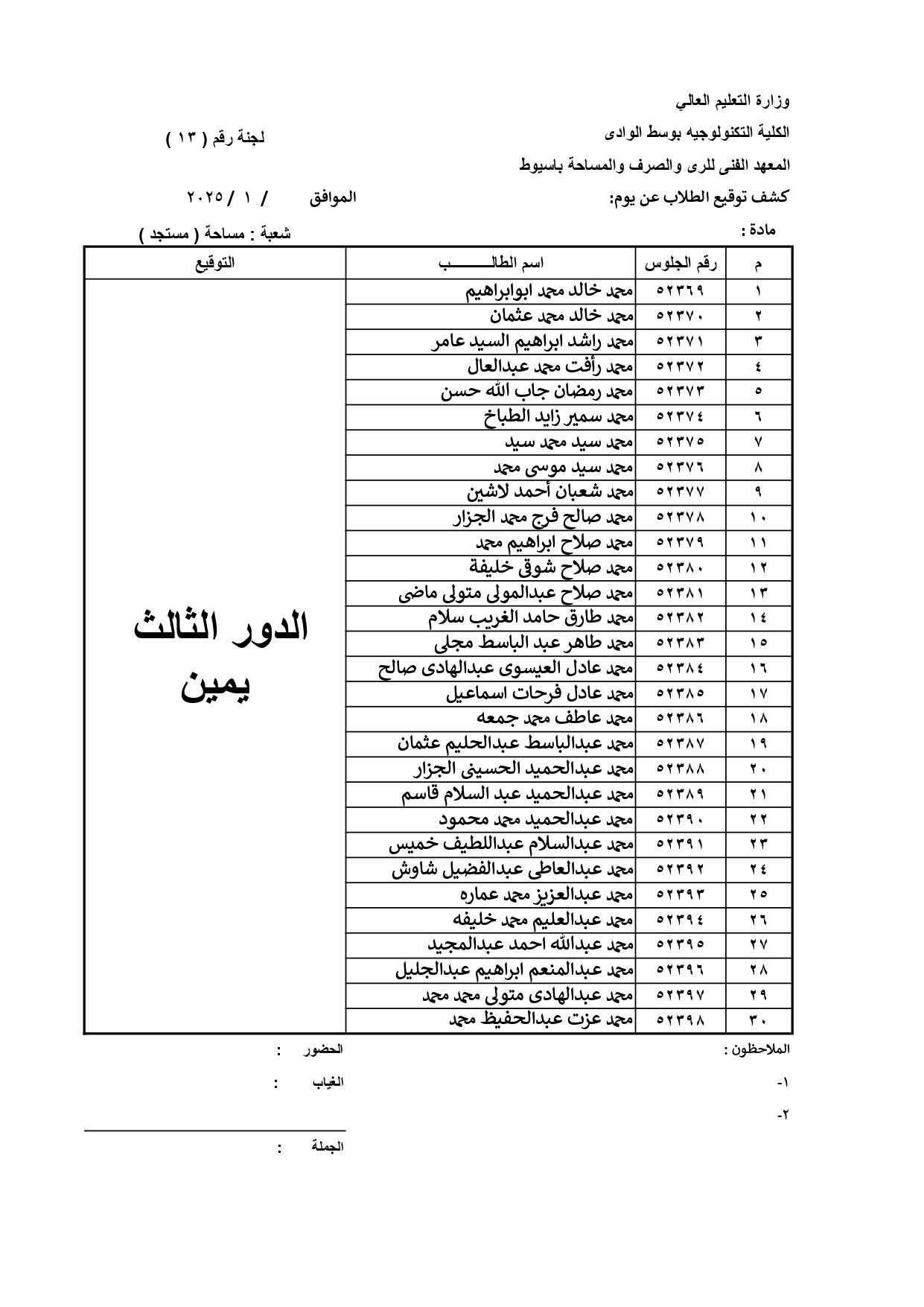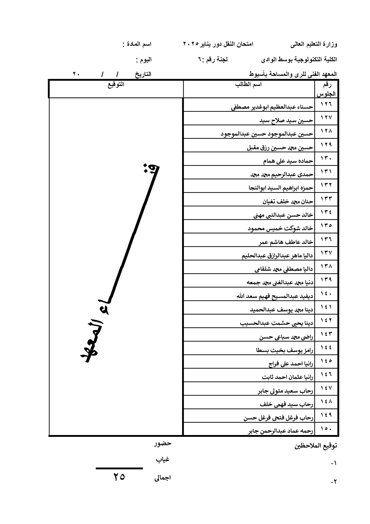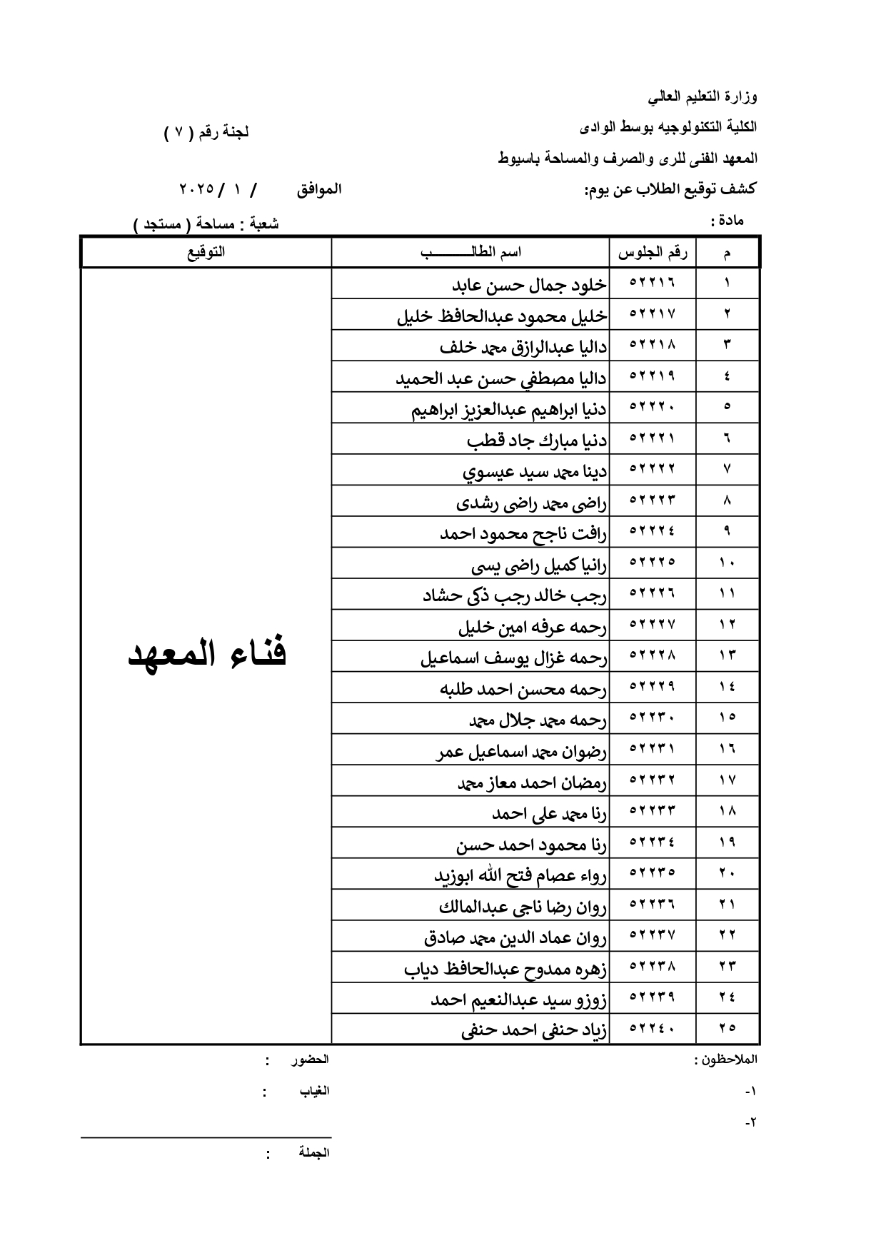| الثلاثاء | 31 /12 /2024 | اجهزة مساحية | 10 | 12 |