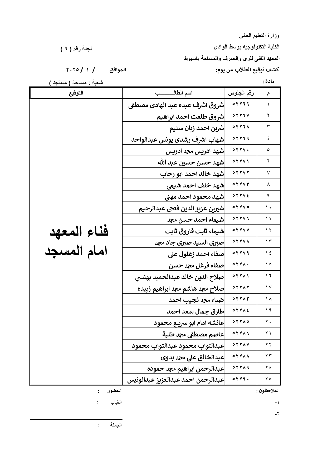 | الخميس | 9 /1 /2025 | مساحة مستوية | 10 | 12 |